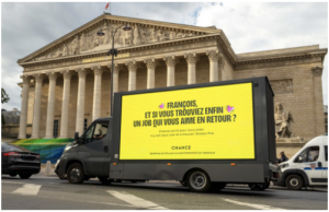• Dernier exemple avec la démission de François Bayrou cette semaine. On a vu ce camion passé devant l’Assemblée. Bravo à Chance pour cette activation drôle et parfaitement dans l’actualité.